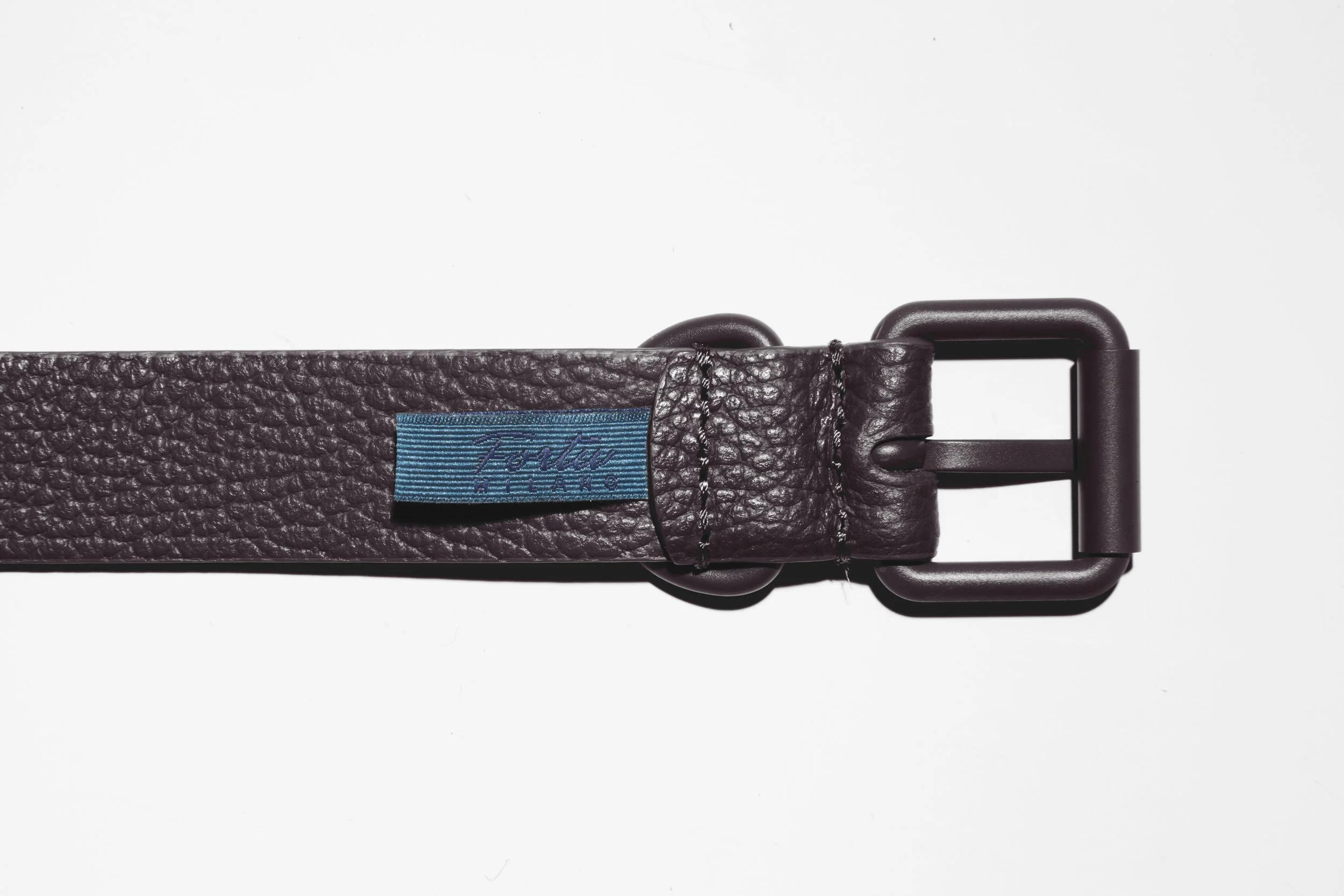 2,5 cm belt features a tonal brass buckle and it’s crafted using pebbled leather in both sides with hand-painted edges.